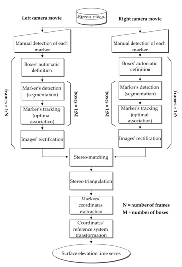 In the experimental investigation, a processing algorithm able to detect markers in the images has been developed. It aims to find the correspondences in the stereo-pairs, and then to track the markers from frame to frame. The sequence of the procedures is outlined in the flow chart of Figure 4.