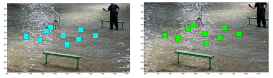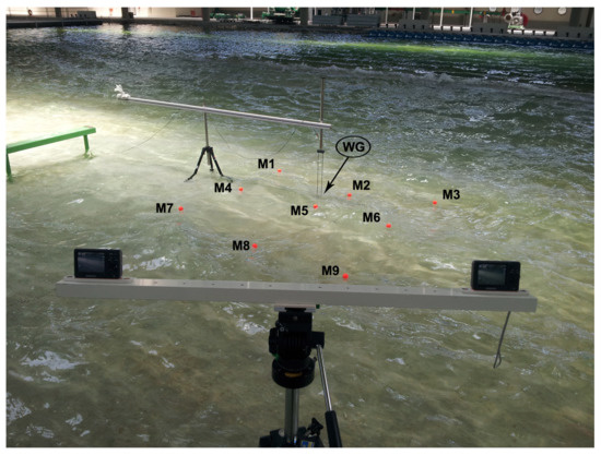 The acquisition system has been placed at a distance of 15 meters from the most distant of the 9 floating markers placed in the nodes of a regular grid, and at a height of 4 meters above the mean water level. The water depth at the location of the markers was ~0.32 m (Figure 11). Markers have been placed approximately to 2 m from each other and a resistive gauge for water level measures has been deployed near the markers named “M2” and “M5” (Figure 6).