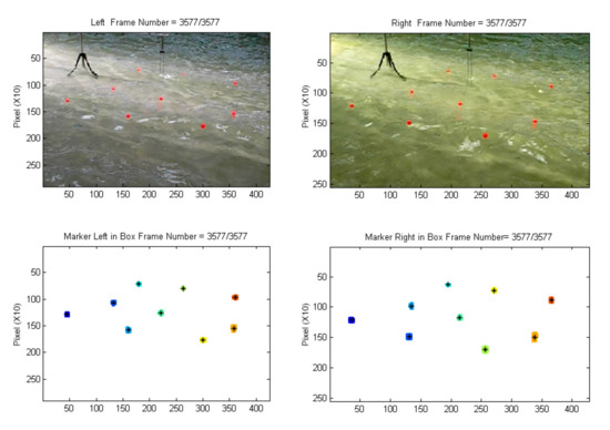 Figure 8 shows a screenshot of the segmentation step: images taken by the two cameras (upper panel) and the result of the markers segmentation (lower panel) are shown.