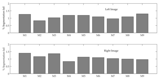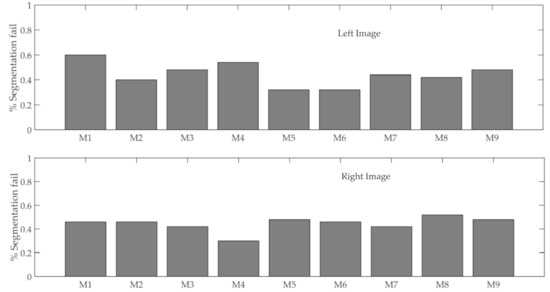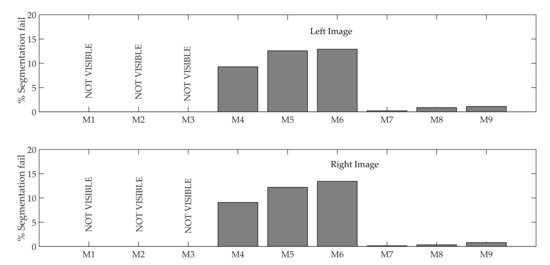 This test revealed a satisfactory performance of the segmentation algorithm as reported in Figure 9 that shows that the percentage of marker detection failures (i.e., lack of detection as defined in Section 3.2) was very low (~1%) both in left (upper panel) and in right (lower panel) image.