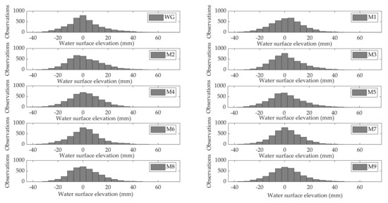 Histograms of the water surface elevation time series estimated from the wave gauge (WG) and markers (from M1 to M9).