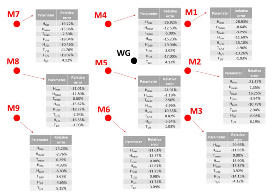 It can be observed from Table 3 that the number of waves is almost the same for markers and probe, and, specifically, the marker “M5”, the closest marker to the control point (i.e., the location of the standard probe), is able to reproduce the same number of waves as the probe. In general, it can be seen that “M2” and “M5” markers better approximate wave parameters calculated from the standard probe data, as they are the closest markers to the location of the standard probe (Figure 6).