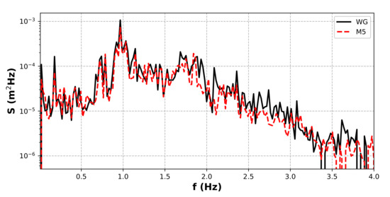 Moreover, frequency spectra have been obtained by means of standard Fast Fourier Transform (FFT) applied to elevation time series. Figure 16 shows the comparison of wave spectra from probe WG (black line) and from “M5” marker (red line).