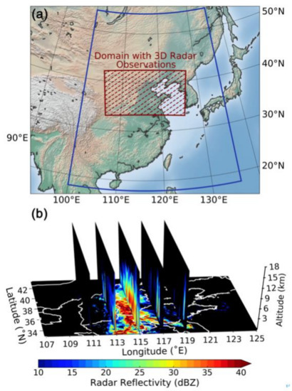 (a) Region of interest (bounded by blue lines) in eastern China. The area hatched in red refers to the domain with three-dimensional (3D) radar observations. (b) The latitude-vertical cross-sections of radar reflectivity (shaded colors) merged by the Advanced Regional Prediction System at 1130 UTC on 19 July 2016 over northern China, superimposed on the composite reflectivity mosaic.