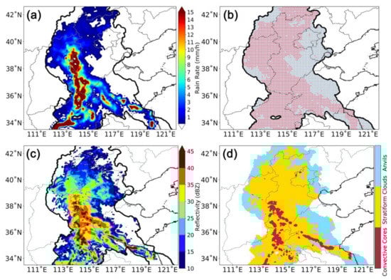 Also applied in this research are ground-based 3D radar mosaics and the China Hourly Merged Precipitation Analysis (CMPA). The 3D radar mosaics used here to identify internal structures of MCSs were acquired from 21 Doppler radar measurements in northern China. The original radar observations were observed at 11 angles of elevation every 6 min. To make the radar information much easier to analyze, the preprocessing module of the Advanced Regional Prediction System (ARPS) [39,40] was used here to interpolate the original observations onto uniform 3D grid points. This dataset offers observations of echo intensity at 36 levels every 30 min, with a resolution of 2 km horizontally (in Lambert projection) and 500 m vertically, almost identical to Feng et al. [26]. The 2 km horizontal resolution of the mosaic product is lower than the 1 km native resolution of the S-band radar, to avoid potential representative issues induced by the inhomogeneity of the radar observation. Note that the radial resolution is evenly 1 km, but the tangential resolution is 1°, making the actual grid spacing vary with the distance from the radar. The vertical resolution is a balance of accuracy and the need for investigation, since the radar only observes the limited levels of specific elevation angles. Interpolation errors are inevitable, especially in regions close to the mountainous area and in the vertical direction, but it should not deteriorate the results, which are the best we can get under current techniques.