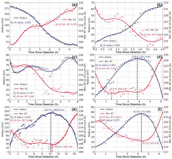 For each MCS of interest, we further derived the fitting curves of its vertical development and size as a function of time (Figure 4). Some of the MCSs have large sample dispersions in the time series of minimum BT and Re observations (e.g., red scatters in Figure 4b), which may include noises but may also contain important features in the MCS lifetime. To extract the main features from noises, we chose sixth-order polynomial fits, following a previous study [28], for the variations in both minimum BT and Re in MCSs over their lifetime. To measure the goodness of fit of the polynomial fitting, we calculated the coefficient of determination as follows:
