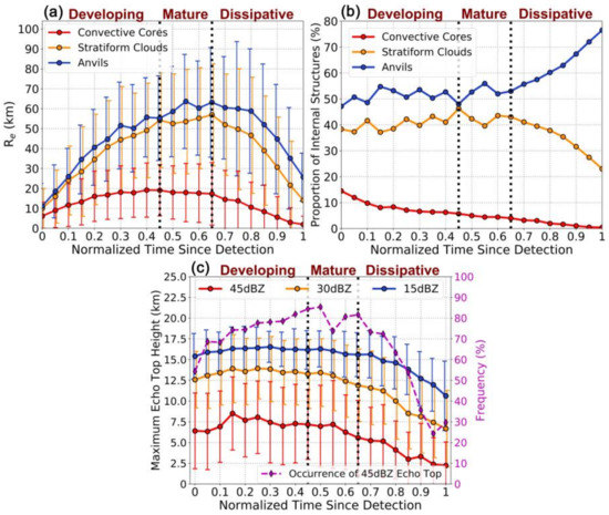Here, we focus on the evolution of internal structures of MCSs over their life cycle in northern China, making use of the ground-based Doppler radar observations available in this region. As illustrated in the composite curves of Figure 9a, the sizes of SCs and anvils are roughly the same during the early stages of MCSs and much larger than those of CCs. Over time, the sizes of CCs increase during the early developing stage and plateau between the late developing and mature stages, before rapidly decreasing during the dissipative stage. On the other hand, the proportion of CCs with respect to the entire MCS cluster area gradually decreases. This is consistent with the conclusions derived from the GPM that the initial stage of convective systems is generally characterized by the largest convective ratio [30]. Meanwhile, the proportion of SCs does not change much during the developing and mature stages but drops sharply during the dissipative stage (Figure 9b). The results also reveal that non-precipitating anvils and SCs dominate in the mature stage, and only anvils take over in the dissipative stage of the MCS when the SCs significantly decline. Although the Re of MCS varies significantly between different stages, the maximum echo top height exhibits smaller variation over the course of its lifetime, generally peaking during the developing stage and starting to decline during mature and dissipative stage (Figure 9c). Given the similarity in the design, resolution and distancing between the Chinese radar network in the research area and the U.S. NEXRAD, the above MCS life cycle and characteristics are compared with those in the U.S. Great Plains in previous studies. For the cross comparison of MCS characteristics, the resolution of the three-dimensional radar mosaics made by ARPS in our study is similar to the NMQ data (National Mosaic and Multi-sensor Quantitative Precipitation Estimate) used in Feng et al. [26]. The NMQ data also have a vertical resolution of 500 m, up to 18 km above sea level, but with a fixed 0.01° horizontal resolution, making the radar data and retrieved results comparable.