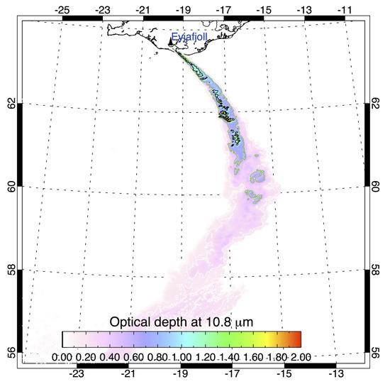 Passive multi-spectral (two-channel) infrared (IR) remote sensing to detect and discriminate volcanic clouds was first suggested by Prata [19]. The radiative transfer theory and some observations using the Advanced Very High Resolution Radiometer (AVHRR) were described. Prior to that study, Sawada [20] utilized single-channel infrared and visible (daytime only) imagery from the Japanese Geostationary Meteorological Satellite (GMS) instruments to infer volcanic clouds from meteorological clouds through differences in spatial and temporal effects. Since these studies, many improvements have been made and more sophisticated approaches have been applied to advanced satellite instruments, such as the MODerate Resolution Imaging Spectrometer (MODIS), the Along-Track Scanning Radiometers (ATSR, ATSR-2, AATSR), the Spin-stabilised Enhanced Visible and InfraRed Imager (SEVIRI), sensors on board the Japanese geostationary platform series (GMS), more recently Himawari-8, and the Suomi-NPP instrument on board the NOAA Polar Platform (NPP), among others. An illustration of the ability of IR satellite instruments to detect ash clouds is shown in Figure 1, where the optical depth (see later) at 10.8 m is shown for an ash cloud from an Eyjafjallajökull eruption in May 2010 using MODIS imagery.