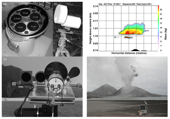 Left (a) and (b): The Ground-based Infra-Red Detector (GbIRD) with five filters used for detecting ash from the ground. Note that at least three wavelengths are required and four is preferable. (c) A calibration rig is installed in front of the camera module to ensure accurate temperature readings. Lower right: GbIRD placed ∼1 km from Tavurvur volcano, Rabaul, PNG. Upper right: Ash mass retrieval from the ground-based camera.