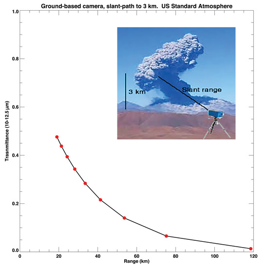 Passive IR instruments can also be utilized to monitor volcanic emissions from the ground [30,31] and when placed near a volcano can provide useful warning of an ash eruption. There are some attractive reasons for using passive IR sensing close to volcanoes, not least from the perspective of safe observation. Unlike the satellite instruments, a ground-based instrument can be customized to detect gases and particles of interest, for example by using tailor made filters to isolate absorption features of SO gas or ash particle effects. Temporal and spatial resolutions also greatly exceed those that can be achieved from an orbiting satellite and because the instrument can be placed where needed there is no latency in obtaining data. Prata and Bernardo [30] demonstrated that ash detection was possible provided that there were at least three channels available and preferably five. The instrument they built–the Ground-based InfraRed Detector (GbIRD) has since been improved but the fundamentals of the technique are the same. Figure 2 illustrates the use of GbIRD and some retrieval results when viewing ash clouds from an erupting volcano a few kilometres away. Because viewing from the surface entails optical paths that contain most of the water vapour, there is a severe constraint on how far an IR instrument can “see” and most of the ground-based measurements were made from just a few kilometres from the source. Figure 3 shows radiative transfer calculations for an IR instrument with a relatively broad band (10–12 m) viewing upwards from the surface towards a target in the atmosphere. At ranges in excess of 20 km the atmosphere becomes so opaque that the signal from an ash cloud or any other cloud is obscured, making detection at these ranges unlikely or impossible. At ranges of more than 50 km it is likely that no detection is possible at all. This somewhat counter intuitive situation, where detection from space at 36,000 km is adequate but ground-based detection from just 50 km is not possible, occurs because 99% of the water vapour is contained in the first few kilometres of the Earth’s atmosphere and the long ground-based paths include all of the water vapour. Infrared camera providers (e.g., FL-IR, see http://www.flir-direct.com/content/thermal-imaging-how-far-can-you-see-with-it) are quick to point out the range limitations for detection, recognition and identification when used from the ground. Claims of detection ranges of 100 km from ground-based trials must be treated with extreme skepticism, see for example https://nicarnicaaviation.com/successful-ground-trials-of-volcanic-ash-detection-with-elbit-systems-clearvision-evs-system/, which is clearly an erroneous claim.