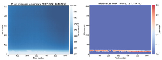 The detection of low-level windblown dust using multi-spectral infrared measurements is anticipated from theory and has been verified through satellite detection [34]. Detection by this method from an airborne platform at 10,000 m is new and lends further support to the usefulness of on-board IR imaging from commercial aircraft. The dust layer observation by the AIRBUS A340 (see Figure 4) was made near the Canary Islands, off the coast of Western Sahara between 13:00–14:00 UT on 19 July 2012. At 13:55 UT on the same day the MODIS/Aqua satellite imaged the same region and the presence and extent of the dust outbreak can be seen in true-colour visible imagery (Figure 5). The location of the A340 and approximate viewing direction is also shown on the figure. Quantitative retrievals of dust loadings are, in principle, possible using these data, but accurate knowledge of viewing geometry and aircraft attitude are needed and these were not logged during this flight. However, proof-of-concept has been demonstrated.