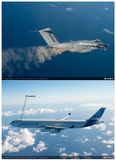 Top: AIRBUS A400 dispensing ash into the atmosphere. Bottom: AIRBUS A340 in flight with the IR cameras mounted in a pod and onto the forward lefthand side of the aircraft.