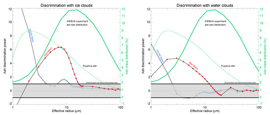 Discriminating power as a function of effective radius for two different pairs of filters when the interfering substance is ice (left-hand side), and when the interfering substance is water (right-hand side). The black lines show the current sub-optimal standard filters (used in the AIRBUS experimemt) and the red-coloured lines show a new pair of filters selected using radiative transfer simulations. Also shown are size distributions for ash used in the AIRBUS experiment and for a sample from the recent Puyehue eruption in Chile.