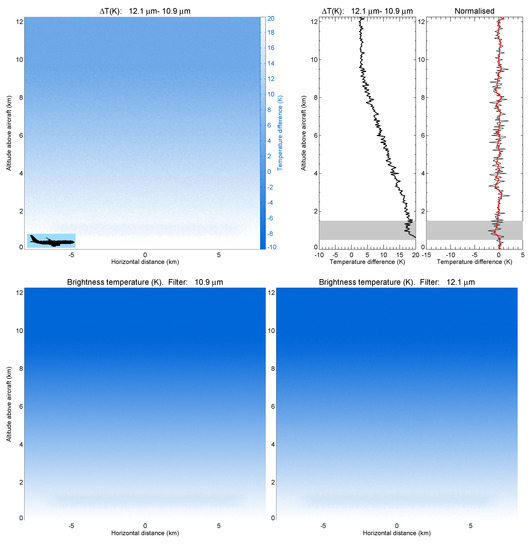 Ash Radiative Transfer (ART) model simulation for an aircraft cruising at 9 km (∼29,500 ft) and viewing an ash cloud slightly above. Top-left: Temperature difference image (12.1–10.9 m). Top-right: Vertical profiles of the temperature difference—the right-hand panel shows a normalised temperature difference. Bottom panels: Individual temperature images. The mean effective particle radius is 3 m typical of dispersing ash clouds in the atmosphere and a mass loading of 0.2 g m is assumed. The mean anomaly is −0.40 K; the minimum anomaly is −2.23 K and the maximum anomaly is 1.07 K. The aircraft altitude is 9 km (29,527 ft).