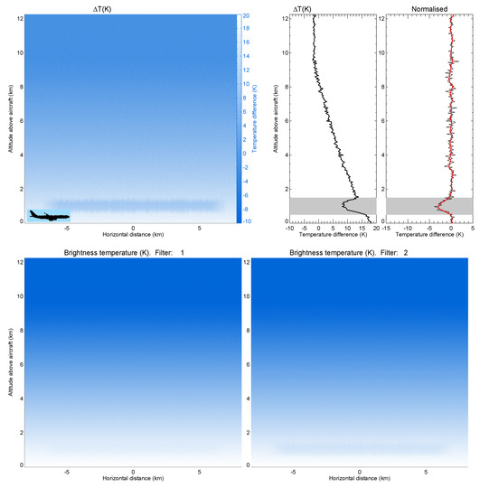 The example shown uses a standard set of filters with central wavelengths at 10.9 and 12.1 m (it makes little difference if these are slightly different). An aircraft is at a cruising altitude of 29,500 ft and views a cloud ∼3000 ft above at a range of 100 km. The top-left panel shows the brightness temperature difference image ( = ). The thin layer of ash (layer depth of 1 km) is just visible in this difference image. An effective particle radius of 3 m has been used. All parameters are typical of what is expected from a dispersing ash cloud some distance from its source. The mass loading is 0.2 g m which is the lower detection limit for a satellite-based sensor. The simulated ash layer is assumed to be homogeneous but some random noise (based on the NEΔT of the detector) has been added for realism. The two bottom panels show brightness temperature in each of the channels. The top-right panel shows a vertical transect through the image: the “normalised” transect is constructed by removing the profile mean. The greyed region indicates the location of the ash layer. A mean anomaly (averaged over the ash layer) of −0.4 K is found for this simulation. The NEΔT for the channels sensing at these cold high altitudes is of the same order of magnitude as the ash signal. Because of noise and lack of sensitivity of this two-channel combination, detection of the ash layer is very poor and in fact an automated system would not be able to identify this layer.