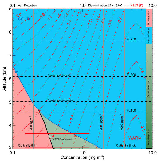The ART model was used to investigate the altitude-concentration space when both ash and ice clouds were present. The ice parameters were taken from References [39,40]. Figure 11 shows the results for the standard filter set (as used on many satellite instruments). The plot shows regions of the atmosphere that are amenable to ash detection (green-coloured), with areas where there is ice confusion in blue. Red signifies no detection is possible. The abscissa shows ash concentrations on a logarithmic scale and the ordinate shows altitude in kilometres. The dashed red-coloured contour lines are isolines of constant NEΔT in K. The top-left of the plot is a region of low ash concentration and cold temperatures, while the bottom right is a region of high concentrations and warm temperatures. The current recommended concentration limits of 0.2, 2 and 4 mg m are shown as vertical lines. Three flight levels are also indicated as are the freezing levels for temperate and tropical atmospheres. The plot shows that there is a region where ash can be detected up to about 15,000 ft provided concentrations are between ∼0.4 and 1 mg m. Detection at higher altitudes fails because of confusion with ice and for optically thin ash clouds no detection is possible below 0.4 mg m and FL200. At all flight levels above FL200 the standard filter set will not detect ash because of confusion with ice. The AIRBUS experiment [33] was conducted at flight altitudes below 10,000 ft and with mean ash concentrations < 1 mg m. The region of the plot where the experiment was conducted is indicated by two horizontal red lines. It is apparent that the simulations suggest ash detection is possible, in agreement with the experimental results. It is possible to relax the detection criterion ( = −5 K was used here) and this permits ash detection at lower concentrations but at the expense of larger noise. The NEΔT isolines suggest that the camera must be very well characterised as NEΔTs in this regime are > 1 K.
