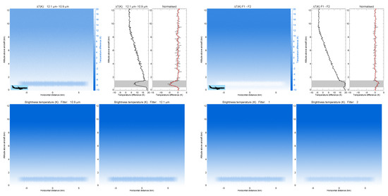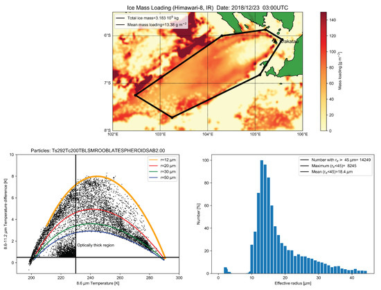 Thermal measurements at 3.7 m and in the infrared window between 8–14 m are well suited to detect thin cirrus clouds and satellite data have been used in numerous studies to quantify sizes and measure abundances of small-sized cirrus particles [56,57,58]. For an imager with just two bands centred at 8.6 and 11 m it is possible to easily detect and quantify cirrus particles [59]. Essentially, small ice crystals absorb IR radiation more strongly at 11 m than at 8.6 m, leading to a strongly positive temperature anomaly when the two channels are differenced. Figure 19 illustrates the detection of ice in the cloud from the eruption of Anak Krakatau in December 2018. The ice cloud was large and generating large amounts of ice that remained in the area for several days. The ice cloud reached altitudes in excess of 15 km and so was hazardous to aviation. Data from Himawari-8 was analysed to determine the amount and and size of the ice cloud and microphysical properties (effective radius, optical depth and mass loading). The ART model was employed assuming oblate spheroidal ice particles. From an aircraft, the detection of ice using an instrument like ASHi would be relatively easy. Indeed because the temperature differences get larger as particle sizes decrease, the sensitivity of the instrument is excellent. As the cloud particles get larger or the cloud becomes optically thick, sensitivities decrease and quantitative retrievals are difficult, however cloud detection is still possible. One issue with using the 8.6 m channel to detect ice is that it is also sensitive to SO. Thus once again the value of high spectral resolution data can be seen, as using another channel at 7.3 m would allow both SO and ice to be unambiguously identified (see next).