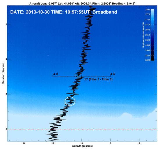 Broadband temperature image acquired by the instrument when the aircraft altitude was 5000 ft and the instrument was viewing upwards and ahead of the aircraft. The solid black line is a vertical temperature difference transect (Broadband-10.8 m filter) through the ash layer. The horizontal scale for the transect is in Kelvin and the noise level is ∼±1 K. The white circle shows the location of the position of the ash layer at the transect location. The ash layer can be discerned in the broadband image through spatial pattern recognition but cannot be discriminated from the meteorological clouds lower down.
