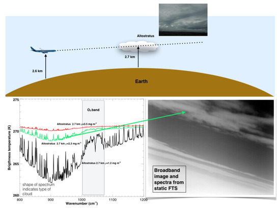 Several researchers [44,45,46] and Reference [26] have shown that hyperspectral sensors on board satellites provide much greater ability to detect and discriminate volcanic ash than the two channel methods. These instruments have 100 s of channels situated in the IR window (8–13 m) and an optimization can easily be performed. However, there is no restriction on the number of channels to use as these instruments simultaneously measure in all channels. We can borrow from the progress made with the hyperspectral imagers to design an instrument for airborne use that is optimally configured for both quantitative ash detection and discrimination. Furthermore, because of the ability to choose amongst many channels the same instrument can be used to detect high altitude ice clouds, windblown dust, some gases (notably SO) and some types of turbulence. The system comprises a sensitive (NEΔT < 50 mK) broadband (8–12 m) imager coupled with an uncooled static Fourier Transform Spectrometer (FTS) with a two-dimensional detector providing a single line of spectral data. The spectral resolution of the detector is customized for airborne platforms and a proprietary rocking/flip mirror is incorporated into the instrument to allow the FTS to scan the broadband image. An example of how the system will determine the type of atmospheric cloud ahead of the aircraft is shown in Figure 16.