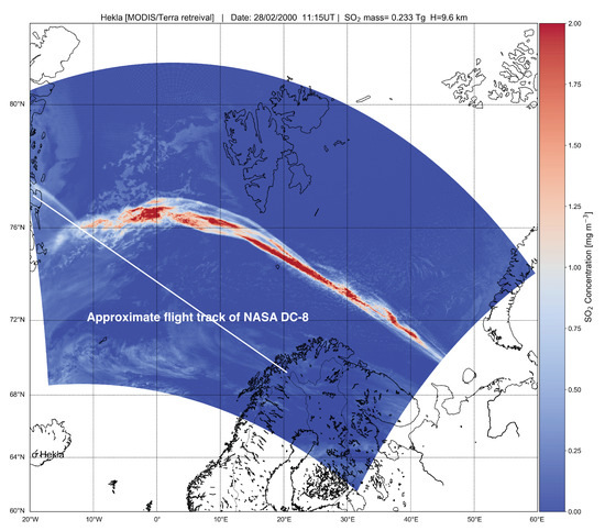 MODIS/Terra SO retrieved concentrations for a plume from the 28 February 2000 eruption of Hekla, Iceland. Concentrations were determined using independent NASA DC-8 aircraft observations of the plume height and thickness and validated against in situ aircraft SO data.