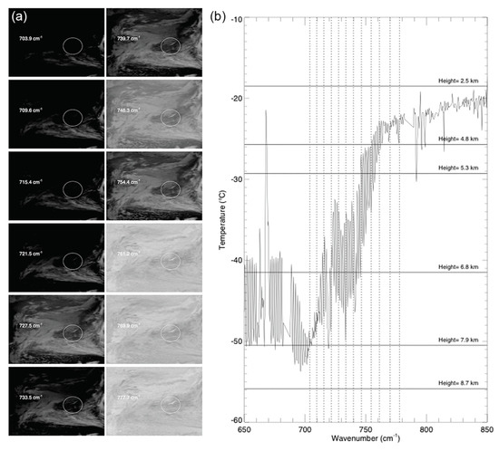 As an example of one implementation of the algorithm to determine the distance to a volcanic ash anomaly Figure 21a shows a sequence of satellite images at different wavelengths from the AIRS instrument. A small volcanic ash plume (circled) from Kambalny volcano, Kamchatka is noticeable in these images. As the wavenumber decreases within the CO band, the plume gradually becomes less visible as the absorption strength increases. Figure 21b shows the approximate heights measured from the surface for the same wavenumbers. The actual height of the volcanic plume was estimated to be ∼7 km (flight level FL230) and Figure 21b shows the plume is no longer visible at wavenumber 721.5 cm, at a height of ∼6.9 km. The height-temperature relationship was determined from an analysed temperature profile used in a numerical weather forecast. While this example is from a satellite platform, the same principle applies when viewing along the limb. An advantage of viewing along the limb is that both the opacity of the object and of the atmosphere are increased due to the longer viewing paths.