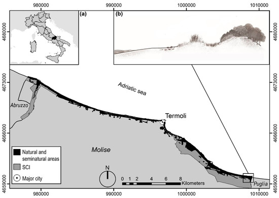 (a) In black, the study area including the coastal dunes of the Molise Region (Italy). Most of the analyzed coastal sectors are included in Sites of European Conservation Concern (SCI, European Directive 92/43/EEC): Foce Trigno-Marina di Petacciato (IT7228221); Foce Biferno-Litorale di Campomarino (IT7222216); Foce Saccione-Bonifica Ramitelli (IT7222217) and belong to the European LTER network [40,42]. (b) An example of coastal zonation. Reference system WGS84 UTM32 (epsg: 32632).