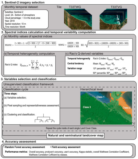 The remotely sensed analysis of seasonality, traditionally based on spectral bands [27,28], has been improved over time by including the time-series analysis of spectral indices [20]. Several metrics have been proposed to quantify environmental seasonality and vegetation phenology based on remotely sensed data [29]. Such metrics commonly focus on describing the cyclic behavior of spectral indices, intended as the combination of spectral reflectance from two or more bands indicating the relative abundance of features of interest, and on identifying key transition dates (e.g., start, peak, end, and length of seasonal periods) [30]. Additionally, other indices, considering the whole array of available bands and used in the past for describing spectral diversity across space, have been recently extended to quantify variations in diversity across time [31,32]. Among them, the Rao’s Q index, borrowed from community and landscape ecology [33,34,35], is able to take into account both the proportion of cells assuming different spectral values and their spectral distance [36]. Consequently, extending Rao’s Q rationale to the temporal dimension (e.g., comparing spectral values and distances of a given location in a multi-temporal stack), makes it a good candidate to accurately synthesize ecosystems’ seasonality. The calculation of Rao’s Q on a temporal stack generates a new layer of temporal diversity, with high or low values indicating seasonal or stable habitats, respectively. Several diversity layers summarizing temporal stacks (bands or spectral indices) can be combined instead of the rough spectral values traditionally used on multi-temporal classification [16,36]. As far as we know, few studies, if any, extending Rao’s Q to the spectral temporal diversity for land cover mapping, currently exist in transitional systems.