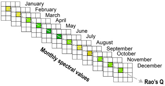 As similarly done in spectral diversity applications, Rao’s Q adapted to detect temporal diversity quantifies the expected dissimilarity between two combinations of pixel values randomly selected within a pixel temporal stack (Figure 3). Pixels representing highly seasonal cover types (e.g., deciduous or annual formations) are characterized by a pronounced within-year variability of biomass values and bare surfaces cover. Therefore, such pixels should assume high temporal Rao’s Q values. On the contrary, pixels representing temporally stable coastal areas (e.g., open sand, pine wood) portraying weak or absent seasonal variations, should score low Rao’s Q values. The temporal Rao’s Q for each spectral index (QMSAVI2, QNDWI2, QBI2) was computed through R package ‘spacetimerao’ 0.1 [59].