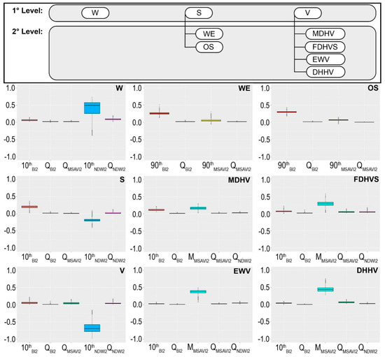 Scheme of the obtained natural and semi-natural cover classes (in the top) along with the respective boxplots showing variables’ values. Reported variables are those selected by VIF analysis and used for classification on each cycle. Classes are: Water (W), Sand (S), Vegetation (V), Water Edge (WE), Open Sand (OS), Mobile Dune Herbaceous Vegetation (MDHV), Evergreen Woody Vegetation (EWV), Deciduous and Humid Herbaceous Vegetation (DHHV), Fixed Dune Herbaceous Vegetation with Sparse Shrub (FHVSS). Variables are QNDWI2: temporal Rao of NDWI2, QBI2: temporal Rao of BI2, QMSAVI2: temporal Rao of MSAVI2, 10thNDWI2: 10th percentile of NDWI2, 10thBI2: 10th percentile of BI2, 90thBI2: 90th percentile of BI2, 90thMSAVI2: 90th percentile of MSAVI2, MMSAVI2: mean of MSAVI2.