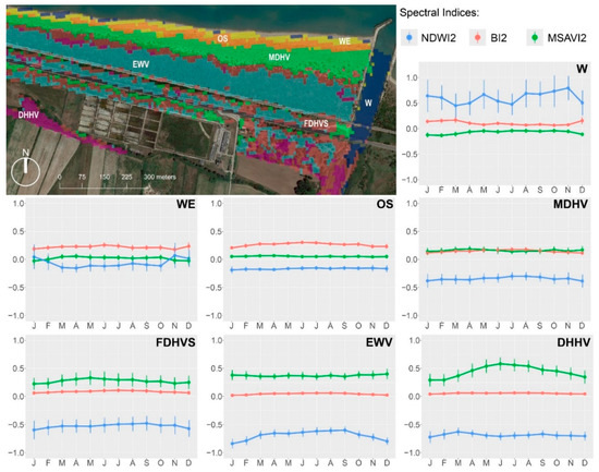 An example of the obtained land cover map reporting classes projected on Google Earth View (on the top) along with monthly average values of NDWI2, BI2, and MSAVI2 ± standard deviation. Water (W), Sand (S), Vegetation (V), Water Edge (WE), Open Sand (OS), Mobile Dune Herbaceous Vegetation (MDHV), Fixed Dune Herbaceous Vegetation with Shrub (FDHVS), Evergreen Woody Vegetation (EWV), Deciduous and Humid Herbaceous Vegetation (DHHV).