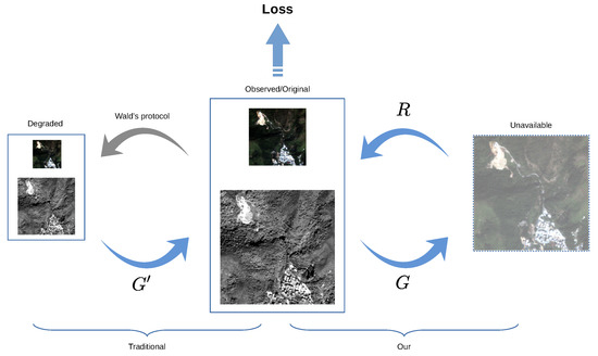 - A reconstructor R which takes as input a generated HRMS image to reconstruct the corresponding LRMS-PAN image pair, with the output denoted as and , respectively;