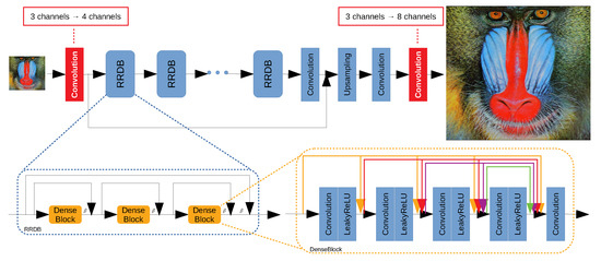 - Wang, X.; Yu, K.; Wu, S.; Gu, J.; Liu, Y.; Dong, C.; Qiao, Y.; Loy, C.C. ESRGAN: Enhanced Super-Resolution Generative Adversarial Networks. In Proceedings of the Computer Vision—ECCV 2018 Workshops, Munich, Germany, 8–14 September 2018; pp. 63–79. [Google Scholar] [CrossRef]