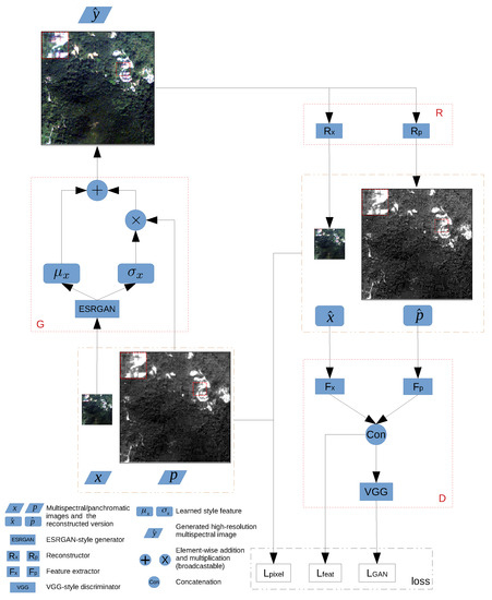 - A discriminator D which takes as input real/reconstructed LRMS-PAN image pairs to calculate feature loss and GAN loss.