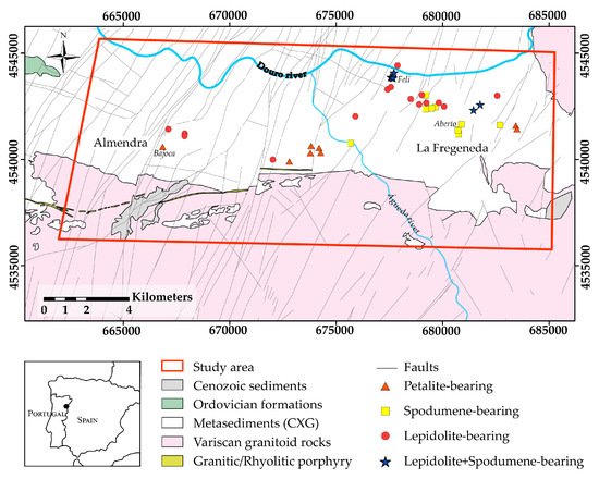 The study area of this work is the Fregeneda–Almendra (Salamanca, Spain—Vila Nova de Foz Côa, Portugal) region, where different Li-bearing pegmatites were mapped using ASTER, Landsat-5, Landsat-8, and Sentinel-2 data, and several image processing algorithms, such as RGB combinations, band ratios, and principal component analysis (PCA) were employed [1,2]. Although these techniques allowed to vector known Li-pegmatites and other potential areas, spectral confusion with urbanized areas or agricultural fields was noticeable. Therefore, a more powerful technique capable of vectoring Li-pegmatites with more confidence is needed, to make the use of remote sensing data in Li-exploration more significant for exploration companies.