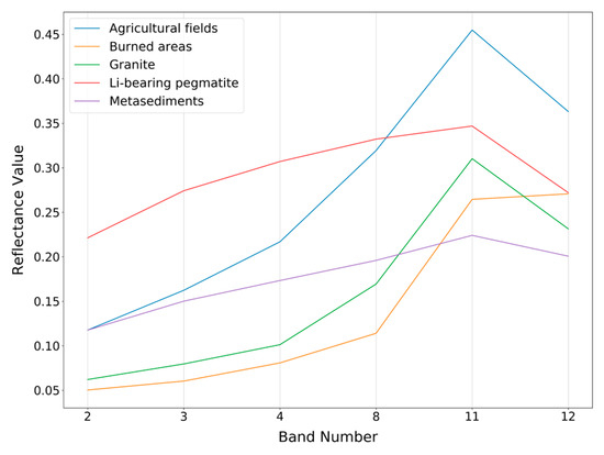 Since different classes occupy different areas on the ground, sample acquisition was not even between classes. The major problem was in the identification of samples from the Li-bearing pegmatite class because of their small exposition. Although the training areas included samples not only from the outcropping dykes, but also from ore stockpiles, the resulting dataset was still very imbalanced as can be seen in Table 2. The spectral responses of the classes for the training pixel samples were computed directly from the Sentinel-2B image—Figure 3.