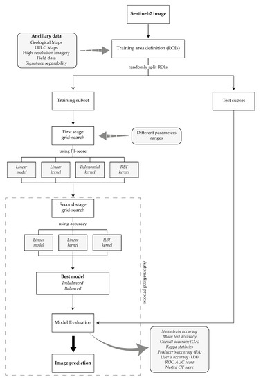 In the second stage grid-search, a stratified 5-fold CV was again implemented, but this time with linear increments around the best parameter values returned in the first step. Whenever possible, the incremental steps employed were the same used by Oommen, et al. [43]. In this second stage, the polynomial kernel was not included, since the best degree obtained in the first stage was always equal to one, and the first-degree polynomial corresponds to the linear kernel when the parameter r equals to zero (Equations (1) and (2)). The downsampling and upsampling strategies were also excluded from the second stage, because the introduction of a random sampling process (that did not consider the ROIs) leads to overtraining problems. Consequently, in the second stage grid-search, only three models were trained for both the imbalanced and balanced data using the class-weight parameter. The choice of the best model was automatized (see Section 3 of the Supplementary Materials) and in the end, two models, one built on the imbalanced data and one using the class-weight option, were applied to the whole image (Figure 4). This means that on the contrary of what happened in the first stage (where each model was trained separately), in the second stage the three models were confronted in the same grid-search and the best model was automatically return. Only the best model returned were subjected to the “Model evaluation” step of Figure 4.