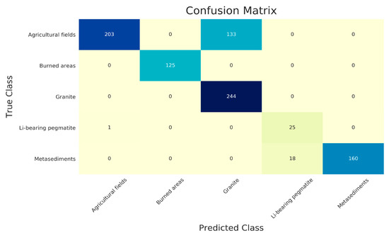 As can be observed, in both models, the greater misclassification errors happened between the Agricultural fields and Granite classes. Regarding the Li-bearing pegmatite class, the Linear-SVM model was the one that maximized the discrimination between the mineralized dykes and the host rocks, but this was done at a cost—a higher number of false negatives. Conversely, the RBF-SVM model minimized the misclassification of true samples from the Li-bearing pegmatite class at the cost of a higher confusion with the metasedimentary host-rocks. These results are in line with the interpretations with the final classification maps obtained for Linear-SVM (Figure 7) and for RBF-SVM (Figure 8).