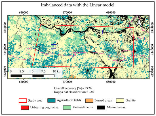 Based on the metrics, especially on the attained OA and Kappa hat, the Linear-SVM appears to be the best model. Plotting the ROC curves for each model tested in the second stage grid-search and computing the respective AUC score allowed to assess the models’ performance exclusively on the Li-pegmatite class (Figure 5). The results show that the use of class balancing strategies improved the performance on the Li-pegmatite class for the Linear model and for the Linear kernel. In the balanced dataset, the best model found through the automatized process, the RBF kernel, was the one that achieved a higher AUC. However, in the case of imbalanced data, the RBF kernel was still the one with the highest AUC, despite the Linear model being chosen as the best model with the automatized process. This happened because the automatized process selects the best model based on the performance in all classes while the AUC score only accounts for the Li-pegmatite class.