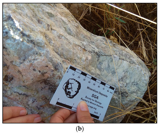 On the contrary to what happens in the Bajoca mine, the ore stockpiles, where the extracted Li-pegmatite from the Feli and Alberto mines are stored, are not located near the open-pits. Therefore, these two known stockpiles were also used to verify the models’ performance in the classification of the Li-bearing pegmatite class (Figure 10). Field campaigns allowed to verify that Li-minerals are present in these stockpiles (Figure 10b). In the case of the Feli stockpile, both models were able to identify the occurrence of Li-bearing pegmatite. Inversely, on the Alberto stockpile, only the RBF-SVM correctly identified most of the areas where Li-pegmatite is present. In what concerns the remaining classes, besides the areas misclassified as Granite, the Linear-SVM was the model that correctly identified most of the Agricultural Fields.