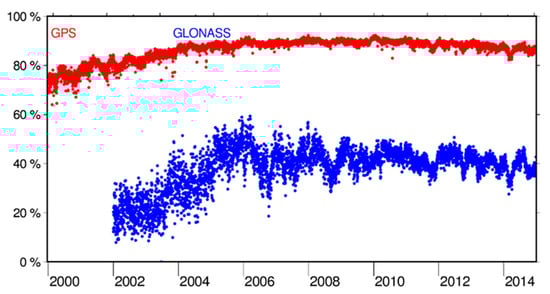 Success rate of the ambiguity resolution for Globalnaya Navigatsionnaya Sputnikovaya Sistema (GLONASS) (blue color) and Global Positioning System (GPS) (red color) observations for the period 2000–2015.