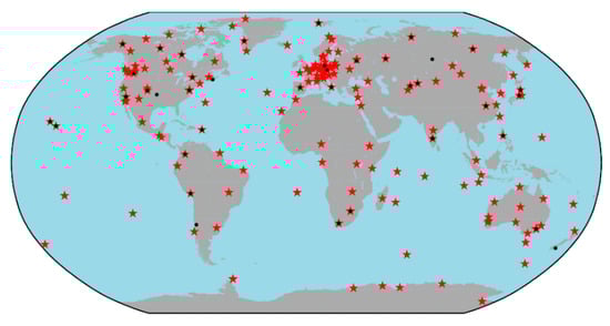 Their geographical distribution is of particular importance for obtaining GNSS satellite clock corrections that are as complete as possible. Figure 3 shows the geographical distribution of the stations delivering high-rate RINEX data for two selected days—January 1, 2003 (black dots), and January 1, 2014 (red stars). As can be seen, besides the increasing number of GNSS stations, the geographical coverage also significantly improves over the years. The coverage over the ocean is, however, not yet dense enough. Consequently, the completeness of the satellite clocks over these areas heavily depends on the availability and completeness of observations from a few stations.