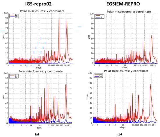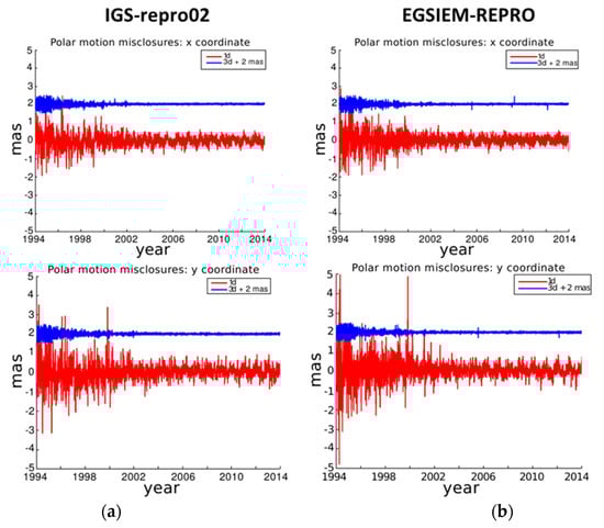 (a) Time series of polar motion misclosures referring to the 2nd IGS reprocessing campaign (IGS-repro02). (b) Time series of polar misclosures referring to the reprocessing campaign carried out in the frame of the EGSIEM project (EGSIEM-REPRO). The top shows misclosures in the x coordinates and the bottom shows misclosures in the y coordinates, plotted with a shift along the vertical axis for clarity. Polar motion misclosures referring to the 1-day solution are shown with red, while polar motion misclosures referring to the 3-day solution are presented in blue.