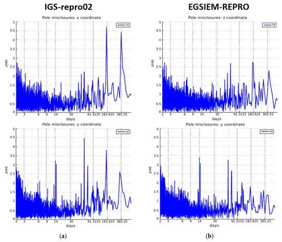 The polar motion misclosures at the day boundaries were calculated according to Equation (1) in [25]. One misclosure value result is used from each day for each of the polar motion coordinates x and y.