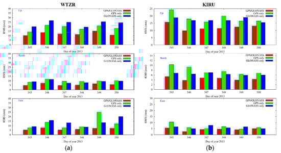 The right side of Figure 10 shows daily RMS values of the coordinate residuals with respect to the a priori coordinates in the north, east, and up components for WTZR station (Wettzell, Germany). As expected, the GLONASS only solution has the worst performance, since the number of satellites is still lower than GPS by about 25%. However, looking at Figure 10a, one can notice that the GLONASS only solution performs better in the north component than with GPS. One possible explanation for this is that the WTZR station is located at +49.08 latitude, therefore having better GLONASS satellite geometry than GPS, since GLONASS has a higher inclination (64.8°) with respect to GPS (55°). In order to confirm this, an additional PPP solution was calculated for KIRU station, which is located in Kiruna, Sweden. The results are shown on the left side of Figure 10, where one can see that GLONASS shows better repeatability in the north component than GPS.