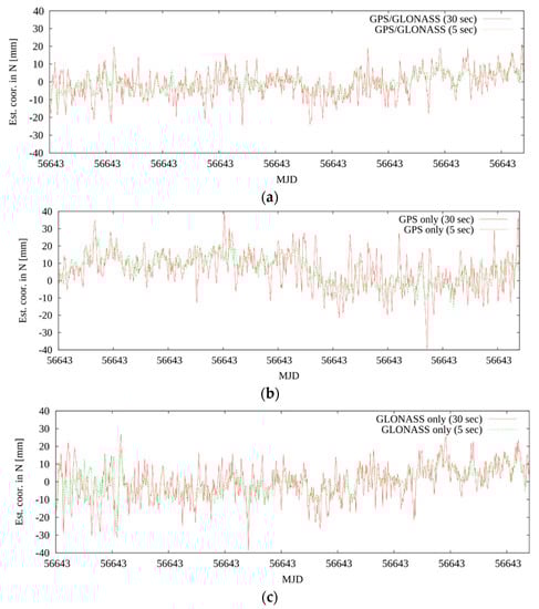 (a) Estimated kinematic coordinates in the north for two different sampling types, referring to the GPS+GLONASS solution. (b) Estimated kinematic coordinates in the north for two different sampling types, referring to the GPS solution. (c) Estimated kinematic coordinates in the north for two different sampling types, referring to the GLONASS solution. All three solutions refer to the first hour on December 17, 2013.