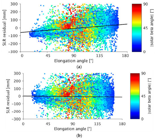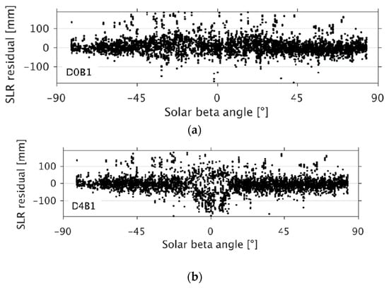 To demonstrate possible systematic effects in the GNSS orbits, we typically present the SLR residuals as a function of the solar beta angle (i.e., the elevation of the Sun above the orbital plane), as a function of the elongation angle of the Sun (i.e., the angle between the Sun and the satellite, as seen from the geocenter [28]), or as a combination of both.