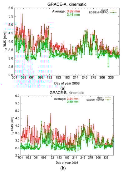 In both cases, the same antenna phase center variations were applied, which were estimated using EGSIEM-REPRO products. For most days, a clear reduction of the phase RMS can be seen, indicating a better fit of the GPS observations when using the new products. In terms of average values calculated over the entire year, the improvement for the GRACE-A and GRACE-B kinematic orbits is 0.36 and 0.44 mm, respectively.