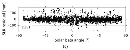 (a) SLR residuals as a function of the solar beta angle with respect to microwave-based orbits of GLONASS satellite SVN 747 over a three-year time span (January 2012 to December 2014): computed using the D0B1 parametrization of the ECOM model; (b) computed using the D4B1 parametrization of the ECOM model; (c) computed using D2B1 parametrization of the ECOM model.