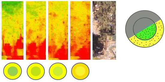Crown moisture content has been correlated with physiological drought stress [26], but frequently, physiological drought stress is only inferred. Lower leaf water content identified spectrally by an increase in NIR reflectance is not necessarily definitive for physiological tree drought stress [38,97,98]. In degrees, physiological drought stress is defined by reductions in stomatal aperture for part or most of the day, decrease in cellular osmotic potential to control loss of cellular water, reduced or loss of cell turgor, decreased cell elongation, drop in relative water content, and in severity, the above plus a change in enzymatic function and necrosis [28]. Of these components, reduced stomatal aperture, decreased transpiration, and a concomitant increase in foliar temperature is definitive alone, but also when compared spatially (within-crown differences with mid crown more stressed than upper crown, or in X vs. M trees) or temporally (early vs. late season, or morning vs. noon).