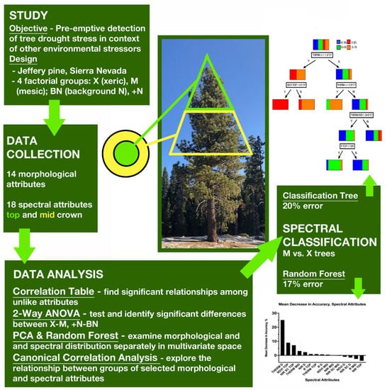 Diagram of study design, data collection, approach to data analysis, and classification of trees based on selected spectral traits using classification tree and random forest models.